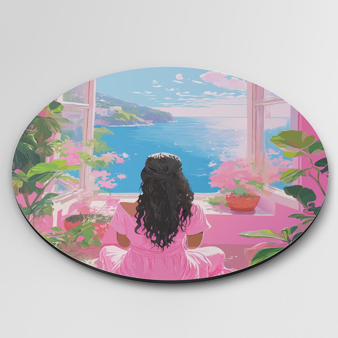 Ontsnap naar een oase van rust met deze prachtige muurcirkel. Een vrouw geniet van een adembenemend uitzicht op de zee, omringd door bloeiende planten. Perfect om je ruimte een vleugje kleur en sereniteit te geven. Hang het op en droom even weg naar zonnigere oorden!