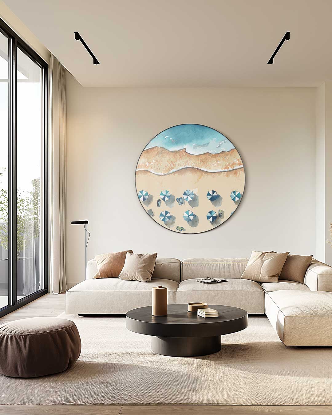 Ontsnap naar een zomerse stranddag met deze prachtige muurcirkel. Met een rustgevende zee en kleurrijke parasols, breng je die zorgeloze vakantievibes direct naar je woonkamer. Perfect om even te ontsnappen aan de dagelijkse drukte en te genieten van een zonnig uitzicht.