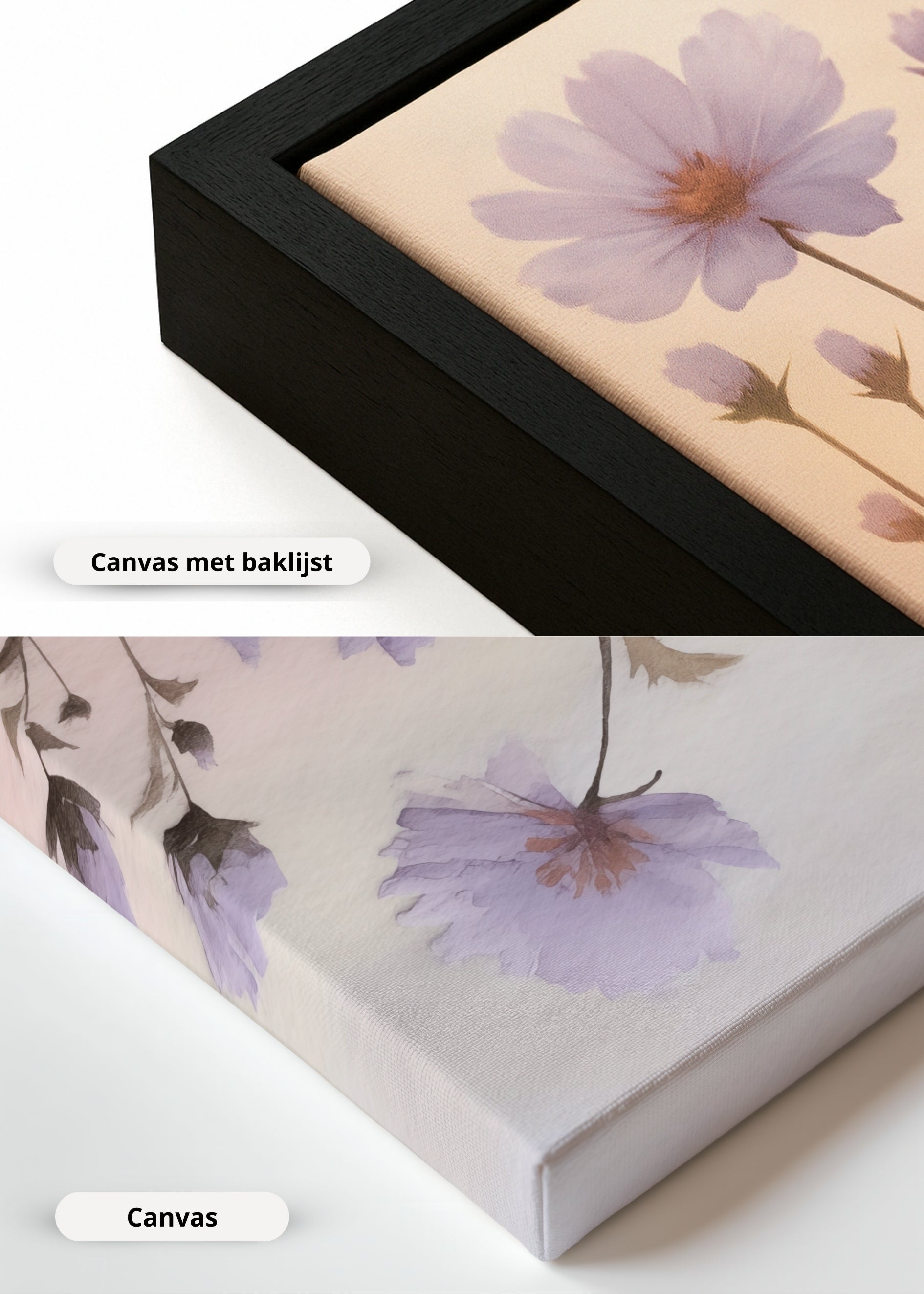 Ervaar de tijdloze charme van onze canvas schilderijen: elk doek wordt gedrukt op wit polykatoen van hoge kwaliteit. De subtiele textuur en matte uitstraling geven het kunstwerk een zachte, huiselijke sfeer – perfect voor woonkamers, slaapkamers of werkplekken. Het canvas wordt zorgvuldig met de hand gespannen op een FSC-gecertificeerd houten frame, waardoor het strak blijft hangen en lang meegaat. Voor een extra verfijnde uitstraling kun je kiezen voor een canvas met luxe baklijst: een elegant kader dat het schilderij net dat beetje meer geeft.