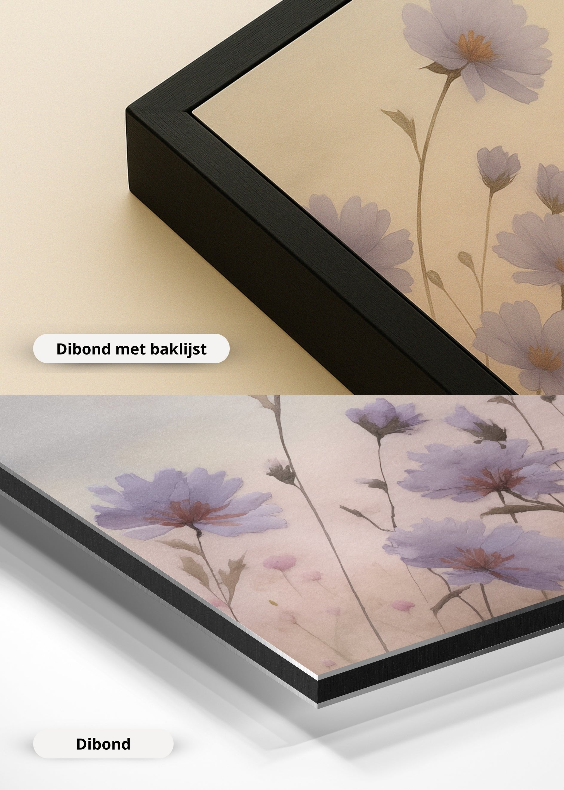 Voor een extra afgewerkte look kun je dibond combineren met een zwarte houten baklijst. De lijst omlijst het werk subtiel en zorgt voor een professionele presentatie.